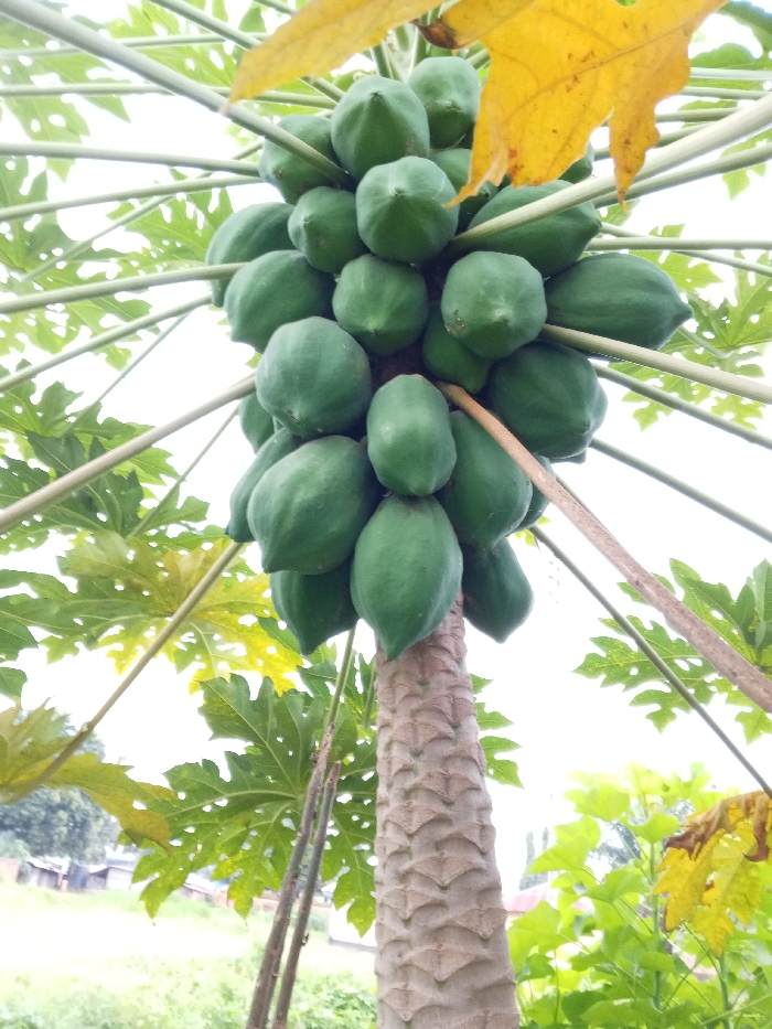 This image captures a close-up, upward view of a papaya tree (Carica papaya) in Makurdi, Nigeria