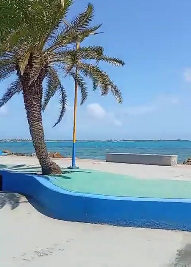 tropical beach scene on a sunny day with a clear blue sky and turquoise water. A palm tree stands prominently on a concrete platform painted with blue, green, yellow, and white. Behind the palm tree, there's a colorful sign spelling out "CHICHIRIVICHE." In the background, there are glimpses of land or small islands on the horizon. The video captures the serene atmosphere of a tropical coastal environment.