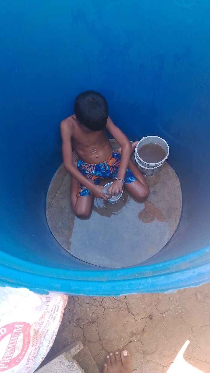 A young boy sits cross-legged in a blue plastic water tank with a circular concrete base