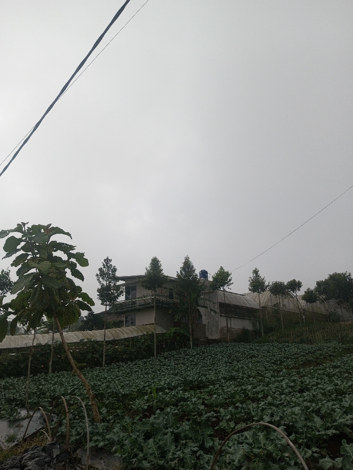 This image depicts a rural or semi-rural agricultural scene in Joshi Vihir, India, under an overcast sky. The foreground features a cultivated field occupying the lower half of the frame, populated with numerous low-lying, dark green leafy vegetable plants, possibly a brassica crop, indicating active farming. Discarded white plastic sheeting and metal hoops are visible on the left edge of the field. A prominent, medium-sized tree with large, dark green leaves and a slender trunk stands on the left side of the field. In the midground, situated on a gentle incline behind the field, is a multi-story building, likely a residence or farm structure, with light-colored walls, multiple windows, and a visible balcony or terrace. A blue water tank is present on its roof. Several tall, slender trees are planted around the building. To the right of the building, a series of arched, translucent greenhouse structures extend horizontally along the landscape. The sky above is entirely overcast, presenting a uniform light grey hue. Two dark utility lines traverse the upper sections of the image diagonally, one from the upper left to center, and another fainter one from the upper right. No individuals are visible.