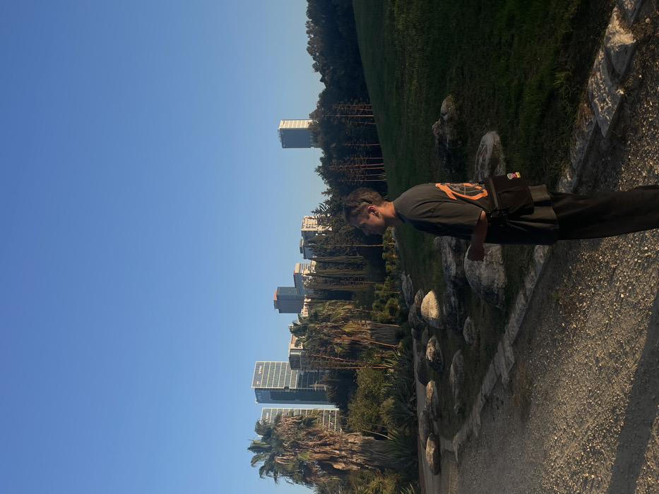 A single male subject is depicted in profile, facing left, standing on a gravel path within an urban park. The setting is Ganei Yehoshua (Yarkon Park) in Tel Aviv, Israel, identified by the prominent Azrieli Sarona Tower and other high-rise buildings visible in the distant cityscape. The subject has short, dark hair and wears a dark-colored short-sleeved t-shirt with an orange graphic on the back, dark trousers, and a black crossbody bag worn across his torso. His gaze is directed upwards and towards the distant horizon. The foreground includes the gravel path and several rounded, light-colored rocks bordering it. The midground features lush green grass and various vegetation, including tall palm trees, coniferous trees (likely cypress), and cultivated shrubs. The background reveals a clear blue sky and the high-rise structures of Tel Aviv. The lighting suggests early morning or late afternoon conditions, with sunlight casting a warm tone.
