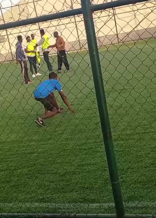 Certainly! Here's a description of the video: The video shows a group of men playing soccer on a fenced artificial turf field. Several of the men are wearing bright yellow vests. One man in a blue shirt is briefly on the ground before getting up. The camera is positioned outside the fence, with a metal pole partially obscuring the view. The overall setting appears to be a recreational sports facility.