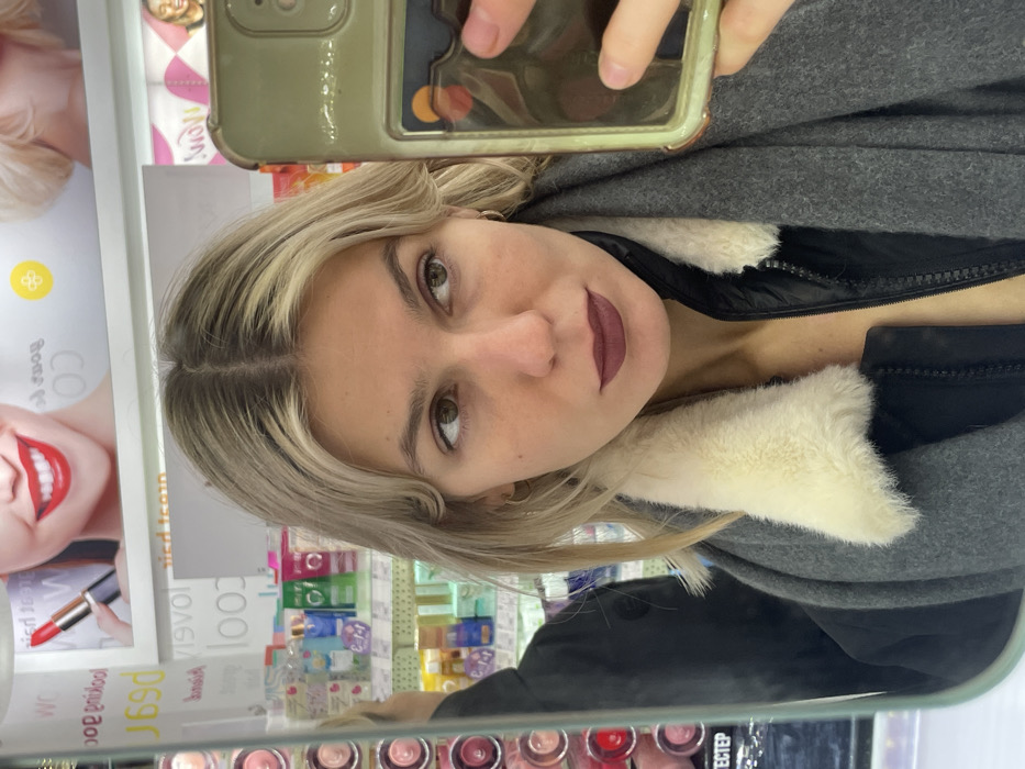 A blonde female is depicted taking a mirror selfie in a retail store in Moscow, Russia. She has shoulder-length, ash-blonde hair with visible dark roots, centrally parted. Her eyes are light brown, and she wears a deep plum-colored lipstick. She is dressed in a black padded jacket featuring a prominent white faux fur collar, layered with a grey woolen scarf. She holds a light green smartphone with a visible cardholder on its back in her right hand, which is reflected in the mirror. The mirror reflects a well-lit store interior, revealing multi-tiered shelves stocked with various cosmetics and personal care products in colorful packaging. Overhead, illuminated advertising signage is visible, including a prominent image of a smiling woman with red lipstick, and reversed text, some of which is Cyrillic. A vertical display unit featuring numerous round makeup pots in shades of pink and red is partially visible to the left of the reflection.