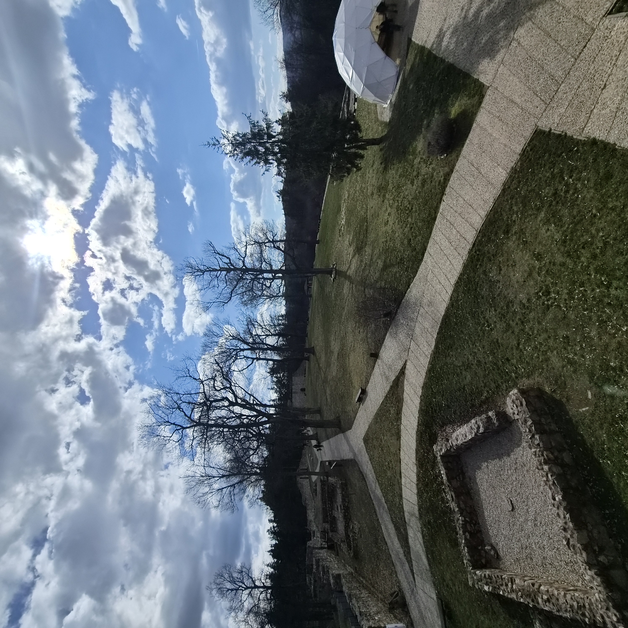 The image depicts an outdoor scene, likely a park or historical site in Belchin, Bulgaria. A stone-paved walkway meanders through a grassy area. Along one side of the walkway, there are stone ruins and bare trees, suggesting an archeological site. A white geodesic dome structure is visible in the upper right corner of the frame. The sky is blue with scattered clouds, and the sun is shining brightly, creating a high-contrast scene. The perspective suggests the photo was taken from an elevated position, potentially overlooking the area.