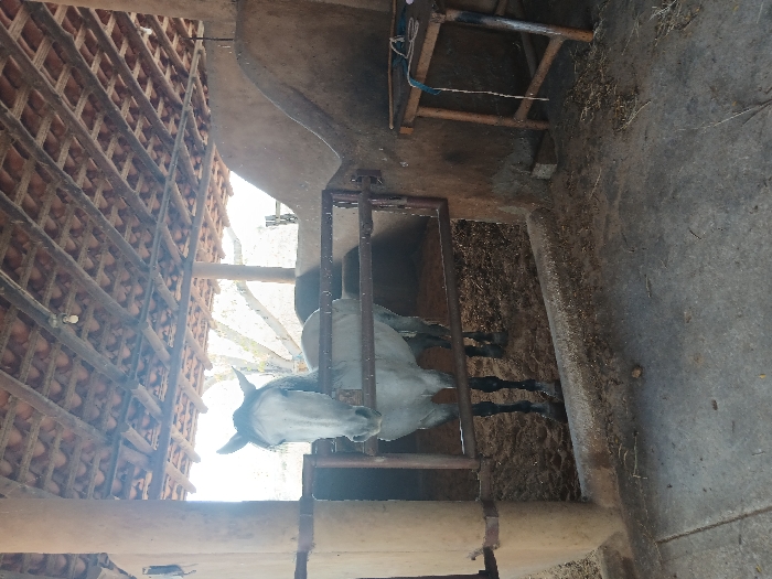 An adult light gray or white horse stands contained within a stable stall in Guayacancito, Venezuela