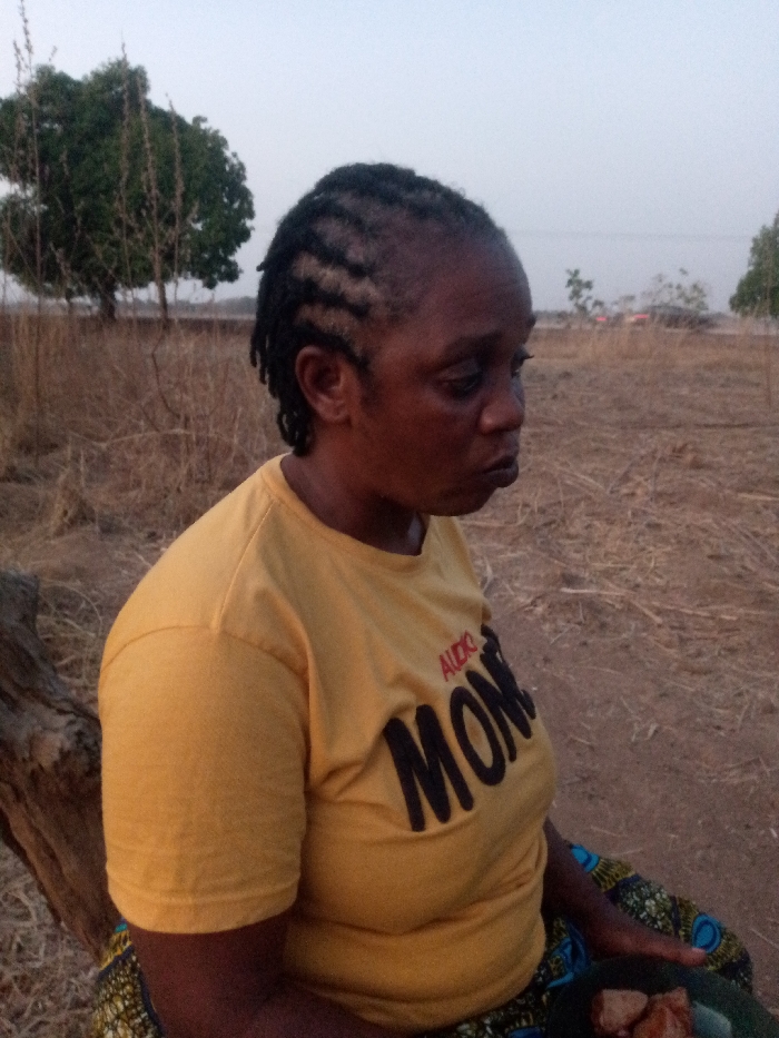 A woman with braided hair and a yellow t-shirt reading "ALEX MONY" sits outdoors. She holds food on a plate. The background is a field with dry grass and trees. The lighting is soft and suggests it might be dusk or dawn. The scene appears calm and rural.