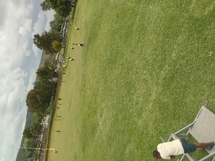 The image displays an outdoor scene at a sports ground in Nakuru, Kenya, under an overcast sky