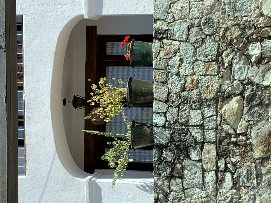 A building's exterior shows contrasting textures. Smooth, white plaster frames an arched window with flower pots attached. Red and yellow flowers spill from the pots. Inside the window is visible a window. To the right of the window, a stone wall with varying shades of grey and light brown creates a rough, textured surface, contrasting with the smooth plaster.