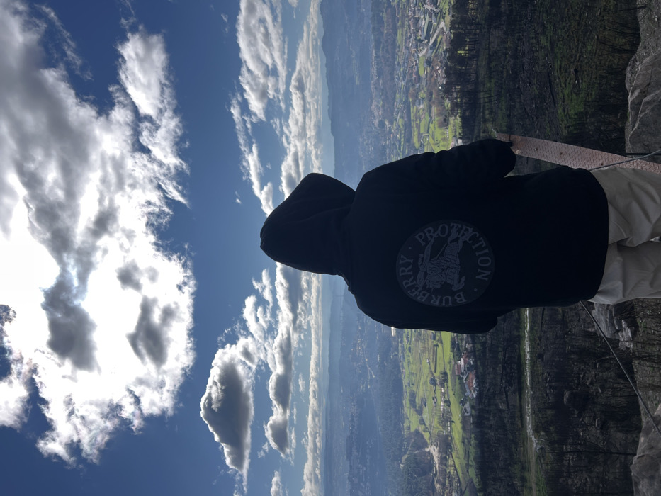 The image displays a single individual from behind, positioned at an elevated outdoor viewpoint overlooking the city of Vila Real, Portugal, and its surrounding natural and urban landscape. The person is wearing a dark, likely black, hooded sweatshirt with the hood covering their head and face. A circular light grey emblem is discernible on the back of the sweatshirt, featuring the text "BURBERRY PROTECTION" encircling a knight on a horse motif. The individual's lower attire consists of light-colored trousers. The person is standing still, facing away from the camera, appearing to observe the expansive vista. In the lower right portion of the foreground, a segment of a weathered, possibly rusted, metallic barrier or railing is visible. The ground immediately surrounding the individual is rocky, interspersed with sparse, dark vegetation. The midground reveals a valley landscape composed of green fields, isolated structures, and distinct patches of dark, possibly burnt or deforested, land. The background extends to a densely populated urban area, identifiable as Vila Real, nestled within the valley, with distant hills and mountains defining the horizon. The sky is bright blue, populated by numerous white and grey cumulus clouds, with strong sunlight originating from the upper left, causing glare through the clouds.