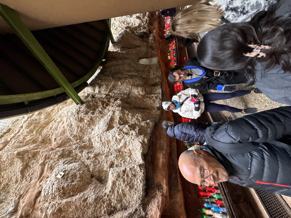 The image depicts an indoor scene within a natural rock formation, identified as the Santa Cova at Montserrat, Monistrol de Montserrat, Spain. The environment consists of rough, light-colored natural rock walls rising steeply. A man-made structure is integrated into the upper right, featuring a dark, curved ceiling supported by prominent green metal beams. Along the lower rock wall, a tiered display holds numerous burning votive candles housed in various colored glass containers, including red, blue, and green. In the distant rock wall, a small, arched, window-like opening or niche is visible. Seven individuals are present. In the foreground on the left, an older male with a bald head and eyeglasses wears a black puffer jacket with a red zipper accent and a black backpack. He is partially turned, looking towards the left. Behind him, a second male in a dark blue puffer jacket is partially obscured. To the center-left, a female wears a white puffer jacket, a blue scarf, a grey beanie, and gloves, holding a small object in her hands while looking right. To her right, a male wears a dark, possibly monastic, garment with a blue sash or stole adorned with a dark cross or pendant; he has dark hair and a mustache, and looks towards the right foreground. To the immediate right, the back of a female's head with long, dark hair secured by a decorative clip is visible. Further back on the right, the back of another female's head with lighter brown hair and a patterned sweater is seen. A blurred figure is present in the far background on the right. Individuals are standing and observing the surroundings, particularly the candle display. No direct interactions are occurring between those prominently featured.