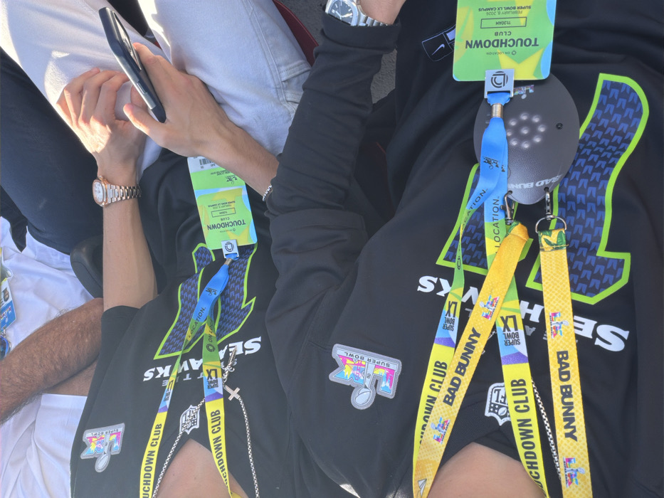 Two people wearing Seattle Seahawks apparel and Super Bowl badges are seated close together. The badges indicate access to the Touchdown Club and feature a yellow Bad Bunny lanyard. One person is holding a phone and wearing a watch. Both individuals have Super Bowl LX patches on their clothing. The badges also have an On Location logo and list the date as February 8, 2026. The overall scene suggests they are attending the Super Bowl LX campus.