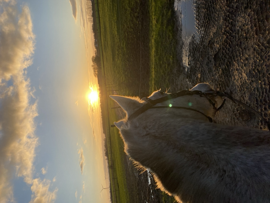 The image showcases a view from horseback during sunset. The horse's head and ears are prominent in the foreground, with tack visible. Beyond, a golden sun illuminates a rural landscape of fields and trees. In the distance, windmills are faintly visible. To the right of the horse, there appears to be a muddy path or road. Clouds dot the sky, painted with hues of orange and yellow from the setting sun.