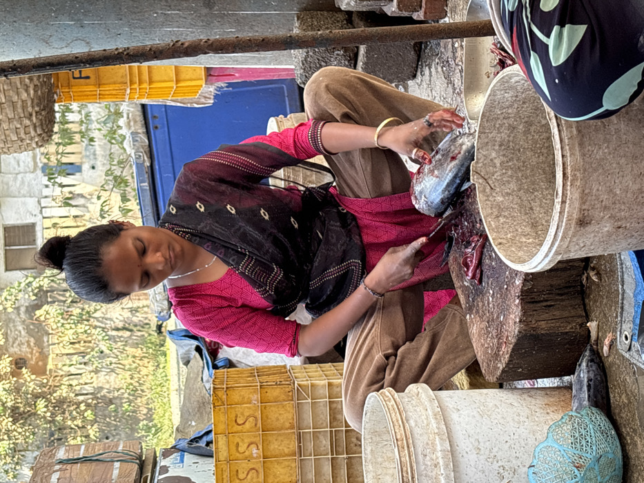 The image depicts an outdoor scene of fish preparation in Ulhasnagar, India