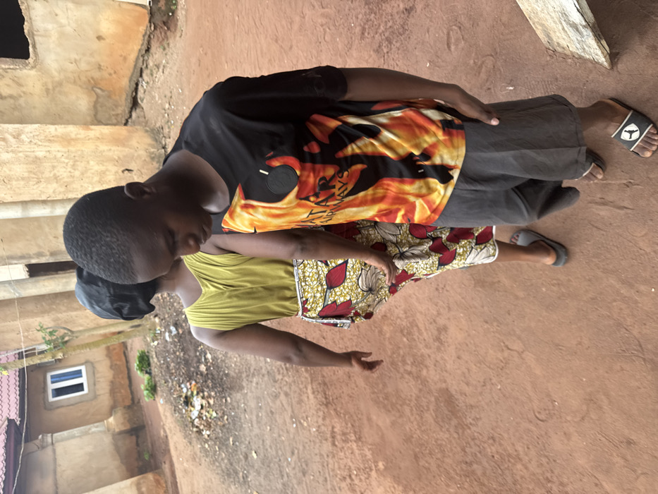 Two individuals are standing outdoors on a reddish-brown surface. One is wearing a black t-shirt with a fiery design, gray pants, and sandals. The other wears a yellow top and a patterned skirt. Buildings and greenery are visible in the background. There appears to be some trash on the ground near the second individual.