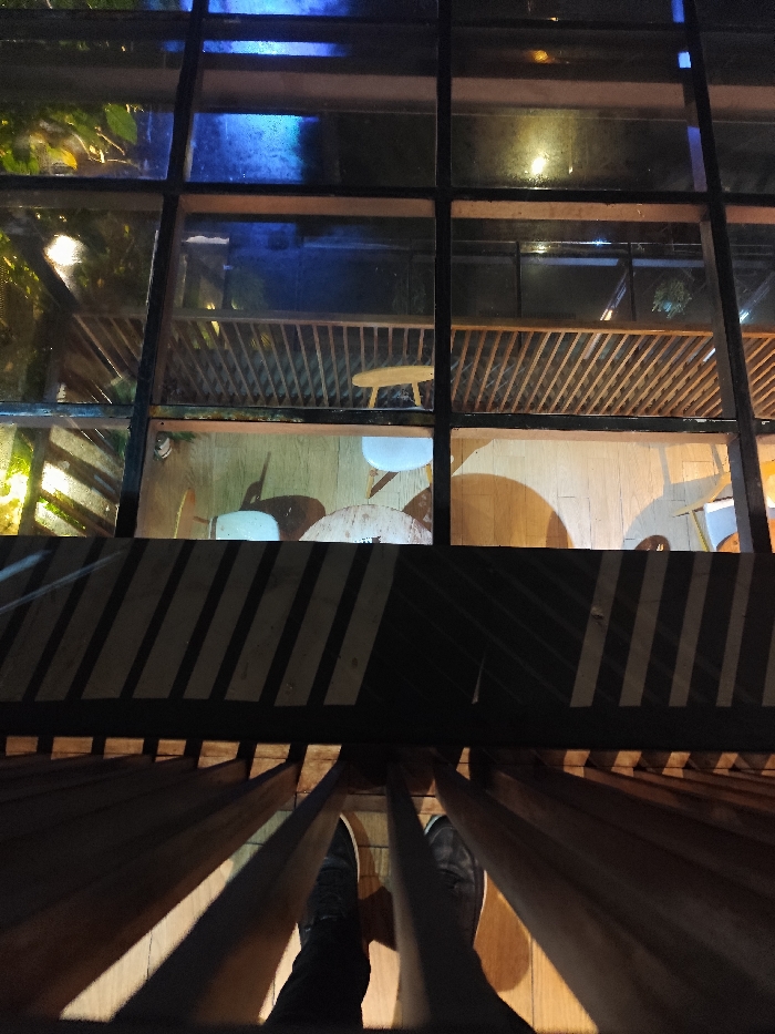 The image depicts a high-angle, first-person perspective shot taken from an elevated position in Ciloto, Indonesia, looking downwards into and beyond an indoor establishment at night. In the immediate foreground, a person's feet, wearing dark shoes, are positioned on a light-colored wooden floor, partially obscured by a dark wooden railing composed of vertical slats. Below this railing, a dark surface with light-colored diagonal stripes is visible. The central and upper portions of the image are dominated by a large glass window facade with dark frames, segmented into multiple rectangular panes. Through these windows, an interior space is visible, featuring a light-colored wooden floor illuminated by internal lighting, casting prominent shadows from furniture. Multiple tables, including at least one round one, and several chairs (some white, some dark) are arranged within this space. Beyond the immediate interior, another wooden slatted railing is discernible through the windows, suggesting a lower outdoor balcony or terrace. The furthest background, visible through the glass, reveals dark outdoor conditions consistent with nighttime, with faint indications of green foliage and reflections of blue and yellow artificial light sources on the windowpanes.