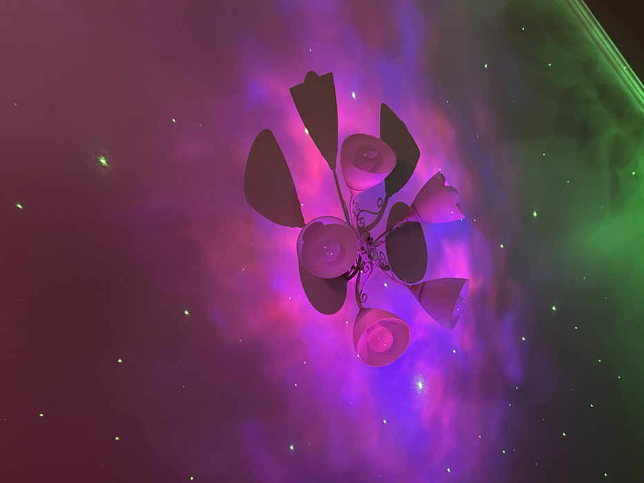 The image captures an indoor scene in Yablonovskiy, Russia, looking upward at a ceiling-mounted light fixture. The fixture, centrally positioned, is a chandelier-style unit featuring a light-colored frame with five or more inverted bell or flower-shaped light shades and several decorative leaf elements. The ceiling and upper walls are illuminated by a dynamic light projection that displays swirling patterns of purple and pink, resembling a nebula. Scattered across these patterns are numerous small, distinct green light points, simulating stars. A prominent source of solid green light is visible in the lower right of the frame, casting a bright green glow upwards and along what appears to be a wall molding. The projected lights brightly illuminate the fixture and its shades, creating a vibrant and atmospheric environment. No individuals or specific actions are depicted.