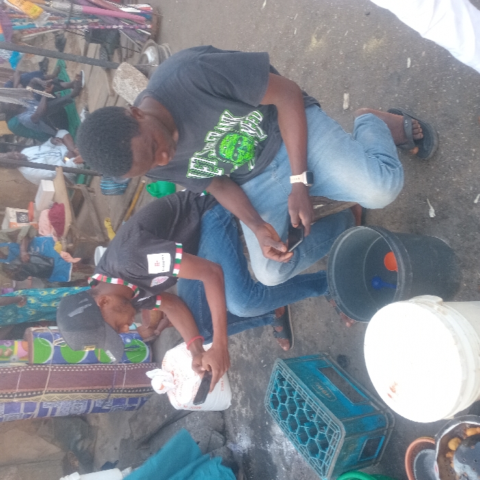 The image portrays an outdoor street or market scene in Maiburiji, Nigeria. Two young adult males are prominent in the foreground. The male on the left is seated, dressed in a black baseball cap, a black polo shirt with red, green, and white collar/cuff details, blue jeans, and dark sandals. He is looking down at a black smartphone held in both hands. Behind him and to his left is a white plastic bag. Directly in front of him on the ground is an empty blue plastic bottle crate. The male on the right is in a squatting position, wearing a dark grey t-shirt with a green "LET'S CRANK UP THE SPEED" graphic, light blue jeans, and dark sandals. He is also looking down at a black smartphone held in both hands; a white smartwatch is visible on his left wrist. Between the two men, a black bucket containing an orange scoop and a blue ladle is on the ground. To the left of the black bucket, a white lidded plastic bucket and a dark pot containing dark material are visible. The ground surface appears unpaved and dusty. In the blurred background, several other individuals are present, some seated, alongside what appear to be market stalls or temporary structures made of various materials.