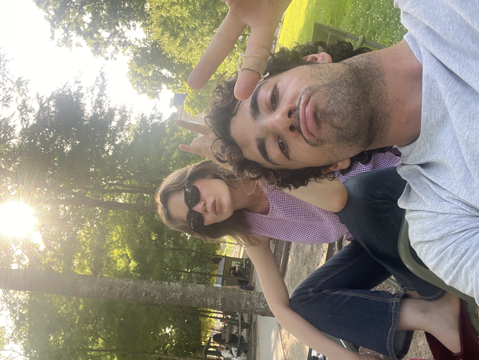 A couple poses for a selfie outdoors. The woman wears sunglasses and a purple gingham top. The man beside her, sporting curly hair, makes a peace sign with one hand and a different hand gesture above her head. A bandage is visible on his finger. They both have pursed lips. Behind them, trees are illuminated by the sun, casting a bright glare. The scene appears to be a park or wooded area.