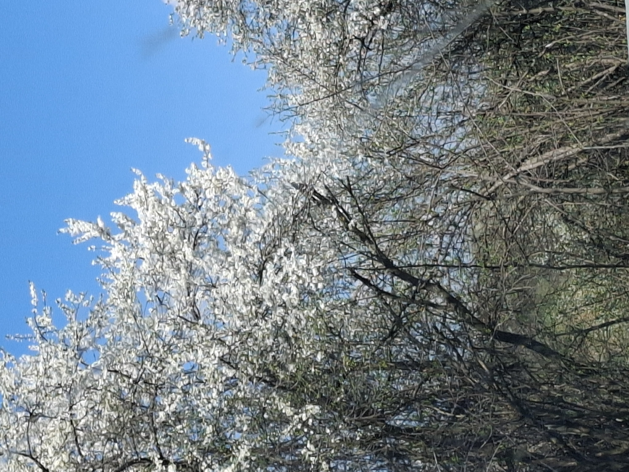 view looking up into trees with white blossoms against a clear blue sky. Some branches are bare, while others are covered in the white flowers. The location is potentially Blagovo, Bulgaria.