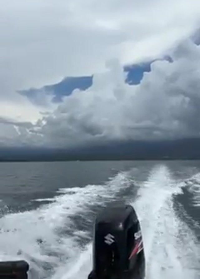 view from the back of a motorboat moving across the water. The boat has a black Suzuki outboard motor. White water sprays out from the motor as the boat moves. In the distance, a coastline is visible under a sky filled with dark, heavy storm clouds and patches of blue sky. The camera pans upwards to show more of the cloudy sky. The water is a dark blue color.