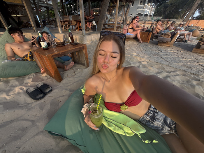 The image depicts a beachside establishment in Thành phố Phan Thiết, Vietnam, during late afternoon or early evening, characterized by warm, golden light. In the foreground, a young adult female with light-colored hair is taking a selfie. She is lying on her left side on a green beanbag cushion on the sand, wearing a red bikini top with a gold-colored clasp and denim shorts. Her left arm is extended, holding a clear glass containing a green beverage with a yellow and green striped straw. Sunglasses are perched on her head, and she has puckered lips towards the camera. To her left, a young adult East Asian male is seated on another green beanbag cushion. He is shirtless, wearing patterned swim trunks and eyeglasses, and is looking down at a black smartphone held in his hands. Between him and another partially obscured individual (whose feet are visible), a rustic wooden coffee table rests on the sand. On the table are two brown glass bottles, a clear glass, and a woven bowl. A pair of dark-colored sandals lies on the sand in front of the male. In the midground and background, multiple individuals are visible, relaxing on various wooden loungers and seating arrangements on the sandy ground. Some are seated under an overhead wooden structure, possibly part of a bar or restaurant, with visible string lights. Palm trees are dispersed throughout the scene, and a multi-story building with a light-colored facade is visible in the far background. The ground is consistently sandy.