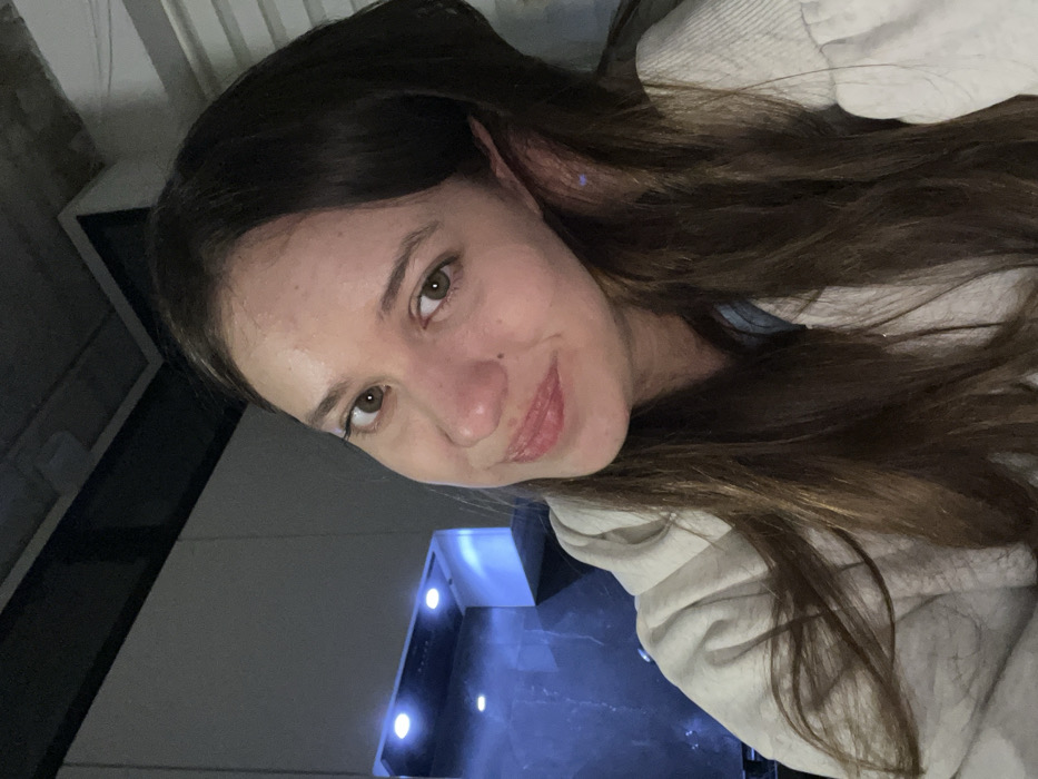 This image depicts a female subject in an indoor environment, specifically a residence in the city of Ketoshi, Russia. The subject, a young adult with light skin, long dark brown hair, and brown eyes, is centered in the frame, looking directly into the camera with a slight smile. She is wearing a light grey or off-white hooded sweatshirt. Her left hand is partially visible near her left ear. The background reveals a modern kitchen area, featuring a dark-colored ventilation hood or upper cabinet system with two integrated circular lights emitting a distinct blue illumination. A flat, light grey wall or cabinet surface is visible behind and to the left of the subject. Overhead structural elements of a ceiling are present in the upper corners of the frame.