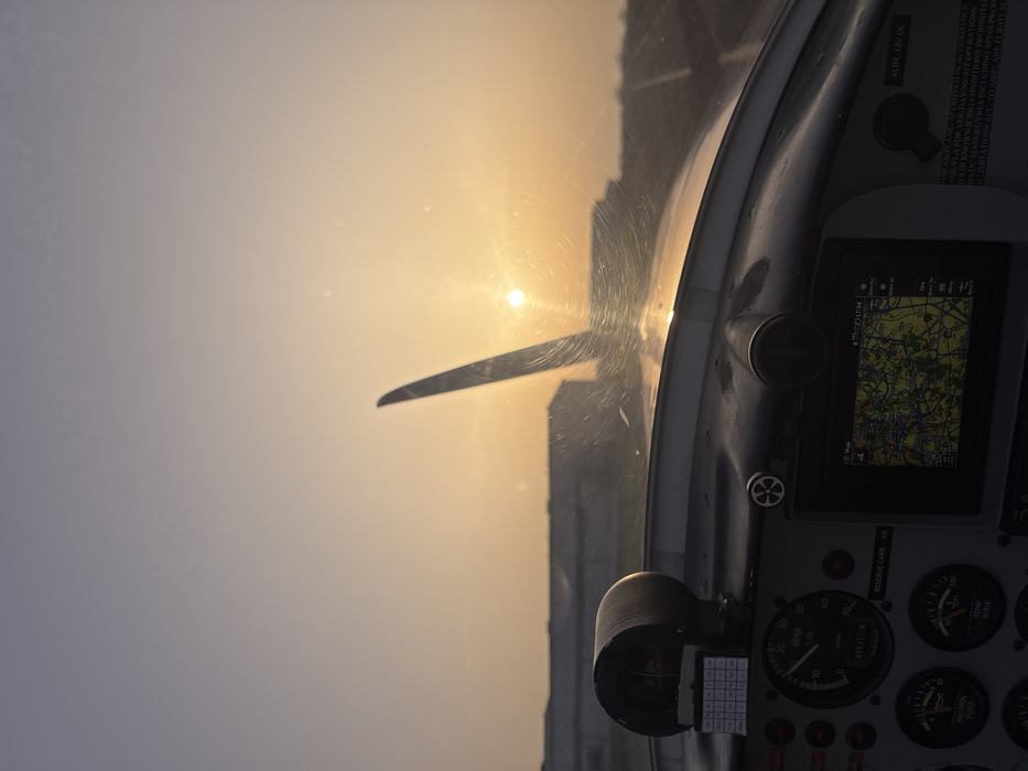 The scene depicts the interior of a light, single-engine aircraft cockpit, viewed through a dirty or scratched windshield, during either sunrise or sunset