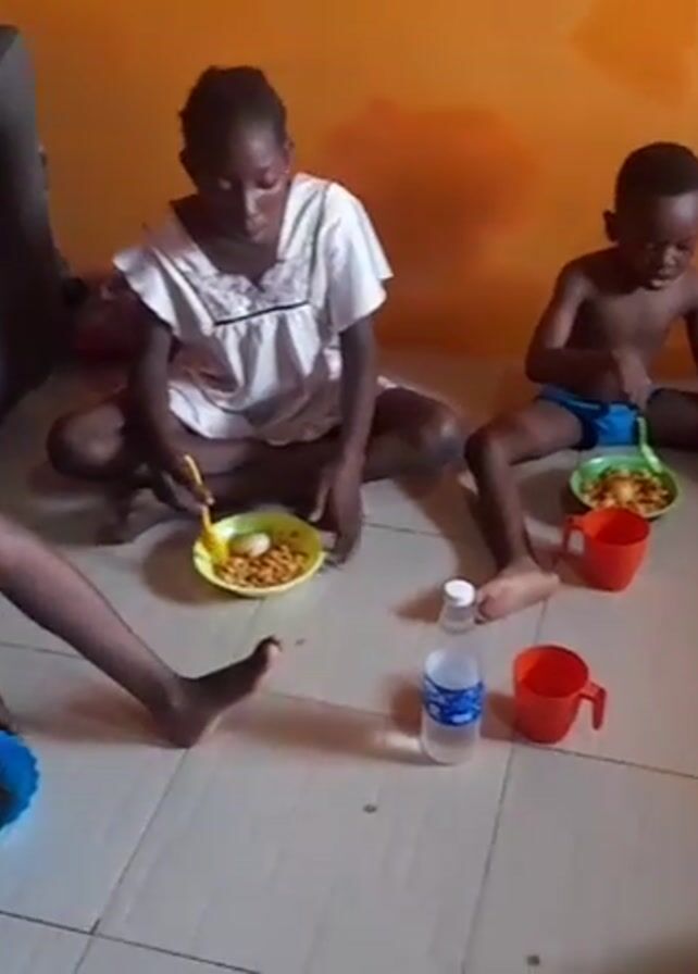 Four children are sitting on a tiled floor in a room, eating from bowls. The room has orange walls and two sofas, one gray and one with a floral pattern. The children are barefoot and dressed in casual clothes. There are two red cups and a bottle of water on the floor between them. The food appears to be pasta with an egg. Music is playing in the background.