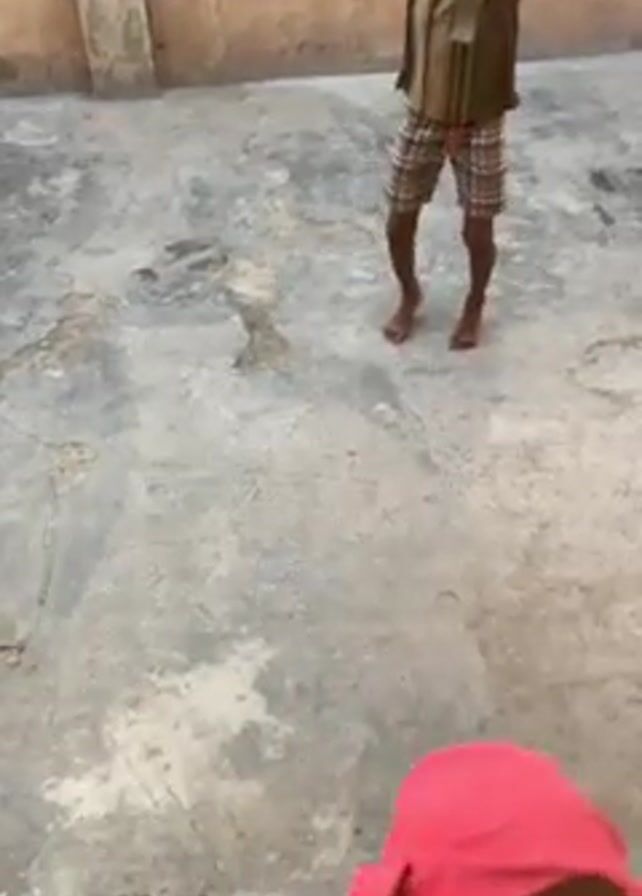 A barefoot young boy in a tan-and-brown patterned shirt and plaid shorts plays in a cement courtyard with a broom