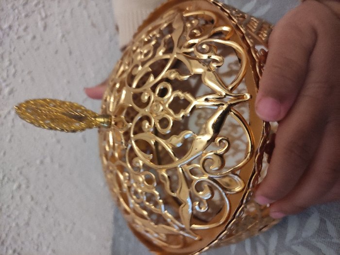 A golden, ornate container, possibly a decorative box or incense burner, is held in a hand