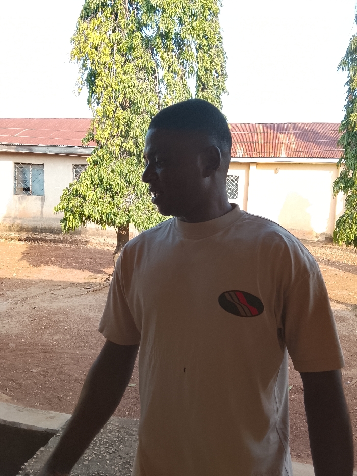The scene depicts an outdoor environment in Akwanga, Nigeria. A male individual, appearing to be of dark complexion with short, dark hair, stands in the foreground, positioned in profile facing the viewer's left. He is wearing a light beige short-sleeved t-shirt featuring an oval logo on the left chest, which contains parallel red and light grey diagonal stripes on a dark background. His mouth is slightly open. The ground is unpaved, consisting of reddish-brown dirt with some lighter, gravelly sections. In the background, two single-story buildings with light-colored walls and reddish-brown corrugated metal roofs are visible. The building on the left features two windows with metal security bars, one of which appears to have a broken pane. Tall trees with dense green foliage are present throughout the background, situated between and behind the buildings. A low concrete structure is partially visible in the lower left foreground. The scene is illuminated by daylight, casting distinct shadows.