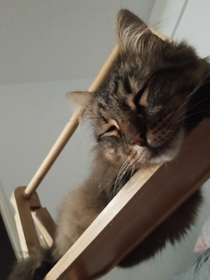 - "A fluffy brown tabby cat rests on a light-colored wooden structure, possibly a ladder or cat tree" by FM-ie7eo1, licensed under CC BY 4.0