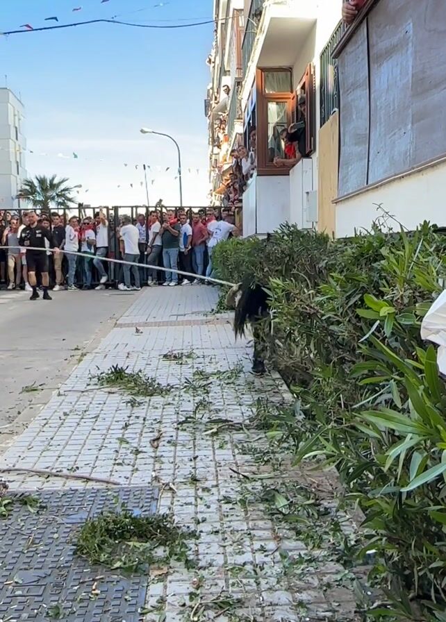 street scene. A crowd of people is visible in the background, and a line of vegetation is on the right. As the camera moves, it suddenly focuses on a human hand with a gold ring on one finger. The palm of the hand is examined closely, revealing skin texture and lines.