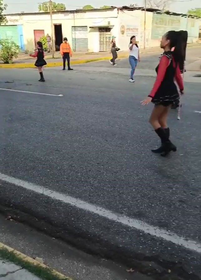 marching band performing on a street in what appears to be a residential area. The band members are wearing red jackets and black pants/shorts. They are playing various instruments, including trumpets, trombones, a saxophone, and drums. There are also several young women in black dresses and red trim with batons performing dance moves in front of the band. A motorcycle passes through the shot in the background. The street is paved and lined with buildings and some greenery. There are some pedestrians observing the performance from the sidewalks. The sky is clear and suggests it's either early morning or late afternoon.