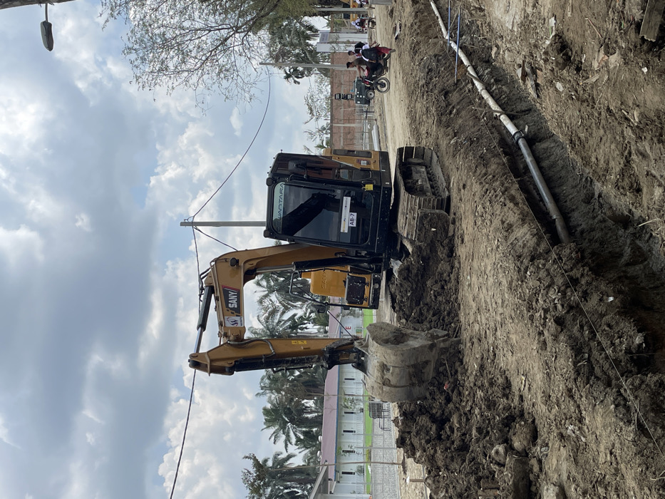 An excavator, bearing the SANY brand, is positioned alongside a trench dug into the earth. A section of pipeline runs parallel to the trench. A street scene unfolds in the background, featuring a moped carrying passengers, and a brick building. Palm trees and a light-colored building are visible across from the excavator, under a sky with clouds. A power line extends from a pole in the sky, potentially intersecting with the excavator's boom.