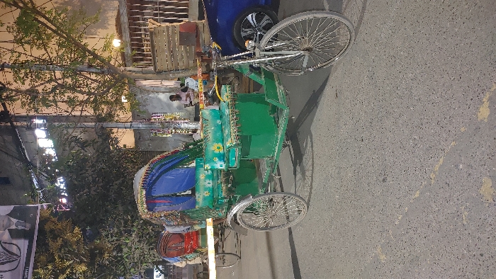 A three-wheeled bicycle rickshaw sits on a concrete street