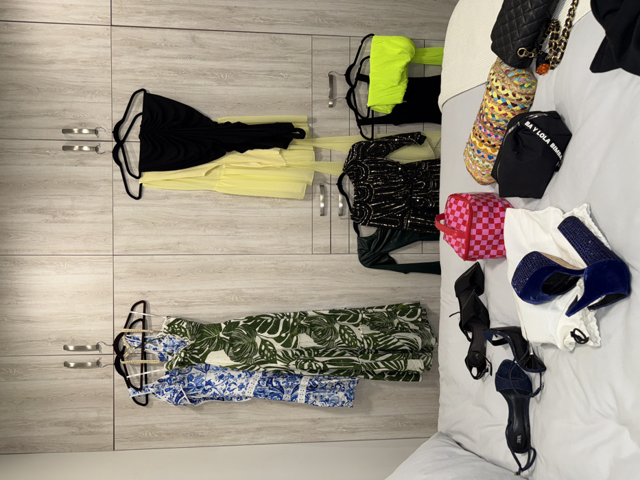 This image depicts an indoor scene, likely a bedroom or dressing area. The specific location within Santa Catarina, Mexico, is not identifiable. No individuals are present. The background features a light wood-grain multi-panel closet or wardrobe unit with silver, curved handles. Six garments hang on black hangers from various points on the closet doors. From left to right on the upper section, these include: a blue and white patterned sleeveless dress with white trim; a white strapless floor-length dress with a green tropical leaf pattern; a sheer yellow flowy top; and a black ruched sleeveless top. On the lower section, from left to right, are: a dark green long-sleeved velvet top; a black long-sleeved top or dress with gold sequin detailing in an arched pattern; a black sleeveless top; and a neon yellow-green strapless top with a long, sheer flowing fabric element. In the foreground, a white duvet-covered bed holds an assortment of shoes and accessories. From left to right, these objects include: a pair of black high-heeled sandals with ankle straps; a pair of dark blue denim-textured high-heeled sandals with ankle straps, one clearly showing "ZARA" on its sole; a pair of dark blue velvet block-heeled shoes adorned with rhinestones, resting on a white fabric dust bag; a pink and white checkered rectangular box with a red handle; a black pouch or cosmetic bag with "BAY LOLA BIMBA" printed in white; a cylindrical, woven bag featuring multicolored stripes (yellow, orange, blue, white, brown); and a black quilted shoulder bag with a gold chain strap. A white blanket or throw is partially visible on the far right.