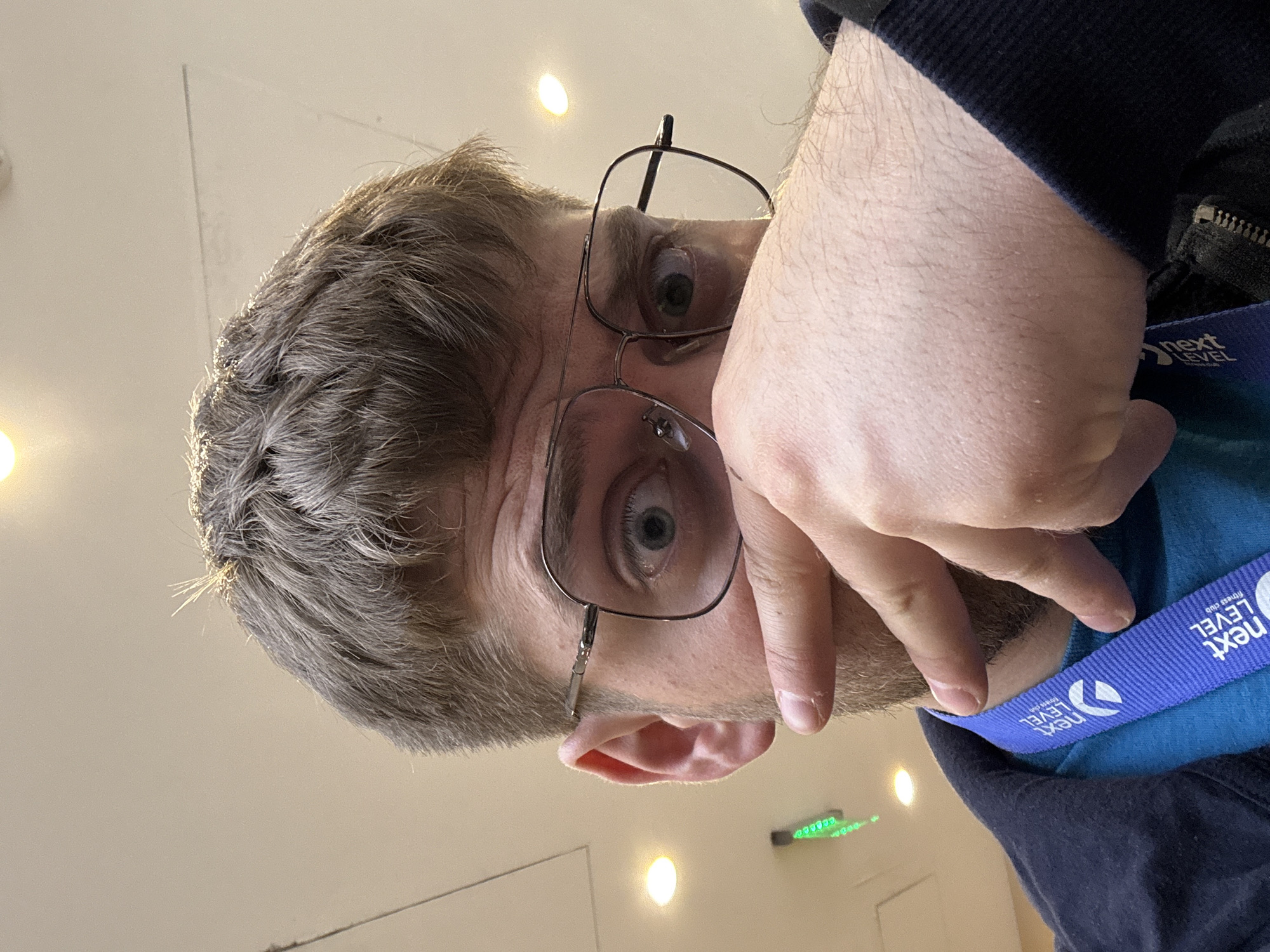 A man is taking a close-up selfie indoors, looking directly at the camera. He has fair skin, short grey hair, and wears wire-rimmed glasses. His right hand is raised near his face. He wears a blue t-shirt and a dark jacket. A blue lanyard with "NEXT LEVEL Fitness Club" printed on it is around his neck. The background is a light-colored wall with recessed lighting. A green emergency exit sign is visible. The location is likely not visible in this close-up shot to determine if it is in Sofia, Bulgaria.