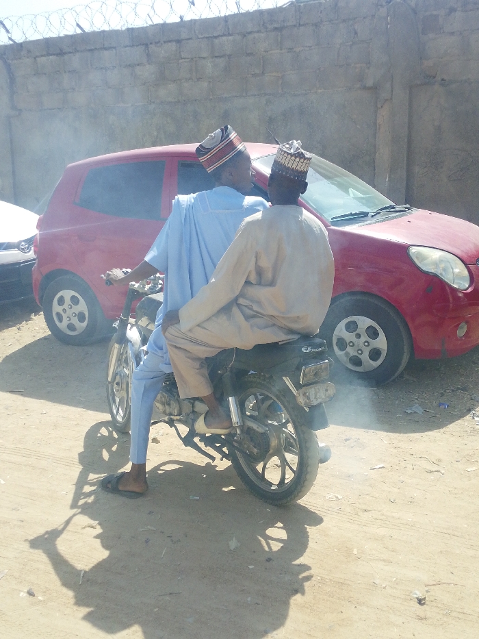The image depicts two adult males on a motorcycle, stationary or moving slowly, on a dirt path in Darmanawa, Nigeria