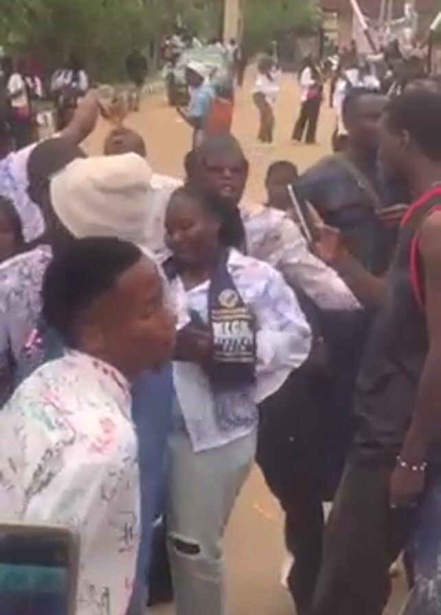 crowd of young people, possibly students, gathered outside of what appears to be a school. The sign above the entrance says “PLATEAU STATE POLYTECHNIC”. The students are dressed in casual clothes, with some wearing white shirts covered in writing and signatures. They are laughing and talking. Several people are holding up their phones, possibly taking photos or videos. A car can be seen driving into the compound in the background. The atmosphere seems festive and celebratory.