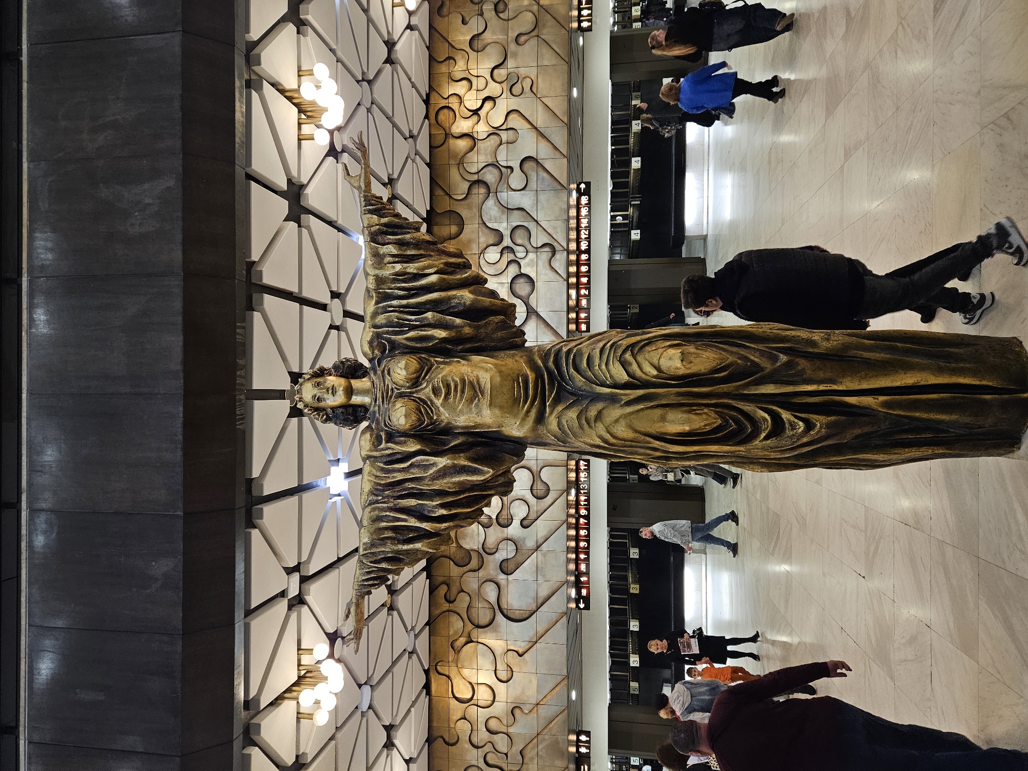 bronze statue of Saint Sophia in Sofia, Bulgaria, at the Sofia Airport. The statue stands in an airport hall with people walking past. Behind the statue are decorative wall panels with geometric and puzzle-like designs. There are also flight information boards visible along the wall.