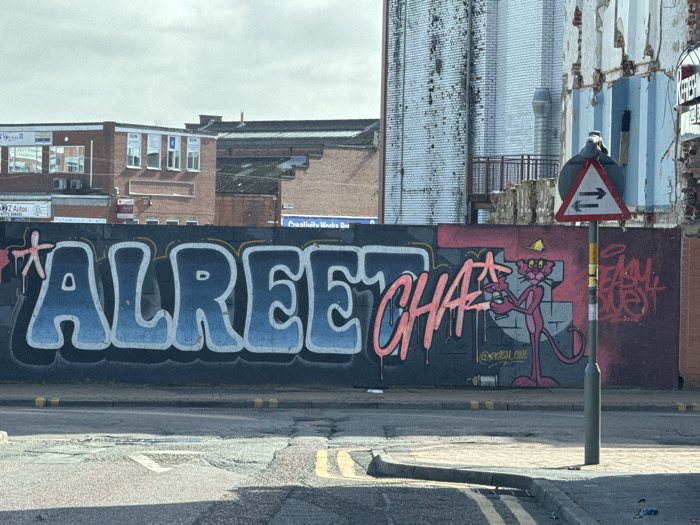 The image depicts an urban street scene in Preston, United Kingdom, under an overcast sky. In the foreground, an asphalt road displays visible cracks, a concrete curb on the right, double yellow lines near the curb, and a broken white line marking the center. Dominating the midground is a dark wall, approximately two meters high, extensively covered with graffiti. The central graffiti piece features "ALREET" in blue gradient bubble letters, outlined in white and black, followed by "CHA?" in dripping pink script. To the right, a pink cartoon character, resembling the Pink Panther and wearing a yellow conical hat, holds a yellow spray paint can while standing next to a white spray paint can on the ground. Below this character, the tag "@KAZAL.ONE" is visible. Further right, an unreadable red tag is present on the wall. A grey metal pole, positioned on the right, supports a triangular red-bordered sign indicating two-way traffic with two black horizontal arrows; a small bird is perched atop this sign. The background consists of various urban structures. To the left, a multi-story brick building features multiple windows, some reflecting the sky, with visible signs including "SN" and "AZ AUTOS". To the right, a tall, partially demolished or derelict building exhibits exposed light blue vertical cladding, brickwork, and a metal exhaust duct. A distant sign partially reads "Creativity Works Dw". No people are visible.