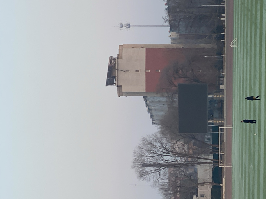 This image depicts an outdoor sports facility in Zhongtun, China, under an overcast sky. In the foreground, a green artificial turf field with white markings is visible, surrounded by a red running track. A large white soccer goal stands on the left side of the field. Two individuals are present on the field: one person in dark attire stands near a white soccer ball on the left, while another person in dark clothing walks towards the right. A smaller white soccer goal is partially visible on the far right of the field. In the midground, behind the field, a large, dark rectangular display screen is mounted on poles. Behind this, bare deciduous trees are interspersed with urban structures. The background features several multi-story buildings. Most prominent is a tall, rectangular building with a light-colored upper section and a dark red lower section, featuring multiple windows. Solar panels are installed on its roof. To the left of this building, a row of similar, light-colored residential buildings extends horizontally. To the right of the prominent building, a tall communications tower with multiple platforms is visible. A thinner, distant tower (possibly an antenna or industrial chimney) is also discernible on the far left horizon. The overall lighting suggests a dull, possibly winter or early spring day.