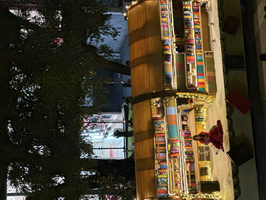 A festive outdoor display features a cylindrical structure adorned with colorful book spines, illuminated by string lights