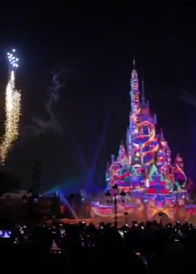In a nighttime video, a crowd of people with their mobile phones raised watch a Disney castle illuminated with bright colorful lights and patterns as fireworks explode behind it