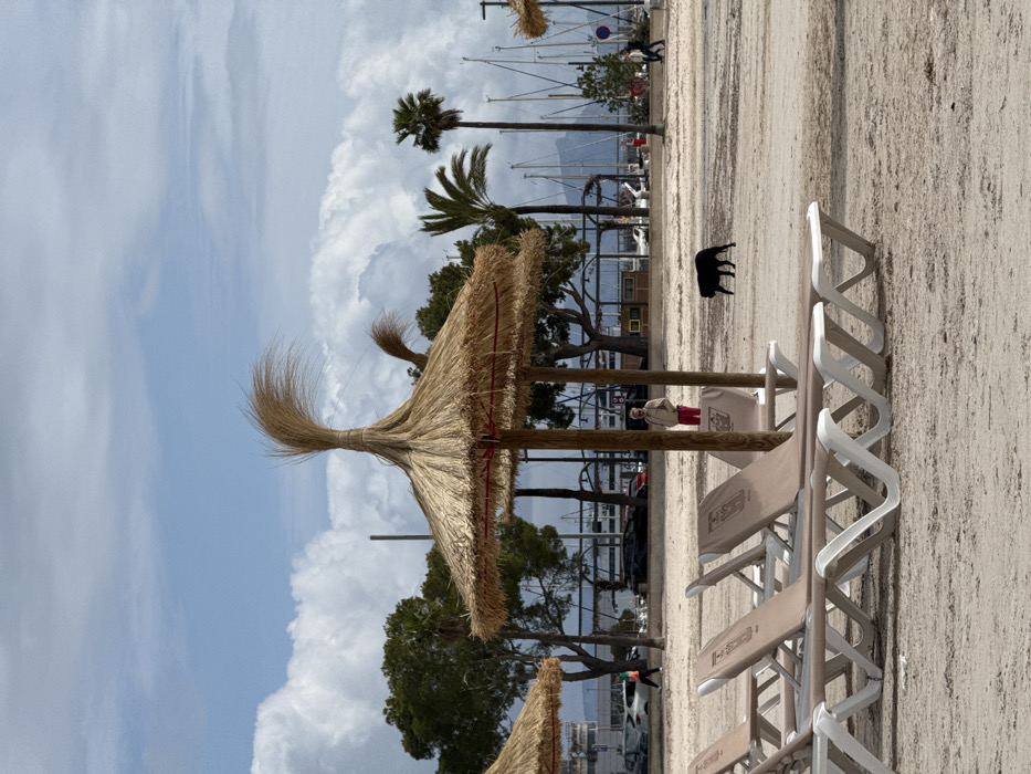 The scene depicts a sandy beach in Alcúdia, Spain, under a partially cloudy sky