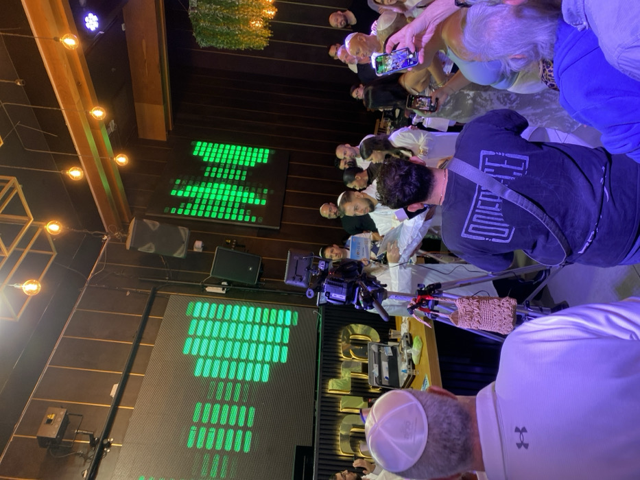 The image captures an indoor event occurring in a venue situated in Holon, Israel. The setting features dark, vertically paneled walls adorned with gold strips, an exposed industrial-style ceiling with visible support structures, and multiple hanging spherical Edison-bulb light fixtures. Green accent lighting emanates from two large LED screens mounted on the walls, both displaying dynamic green sound equalizer graphics. The larger screen on the left also shows partial Hebrew text at its base. Several dark speakers are mounted on the walls. In the foreground, an individual with their back to the viewer wears a dark t-shirt featuring the word "UNIQUEPEACE" and a shoulder strap. To their left, another individual with their back to the viewer wears a white polo shirt and a white kippah. Centrally positioned, a professional video camera on a tripod is aimed towards an elevated stage or bar area. A woven straw-colored bag is attached to the tripod. On the elevated platform, several individuals are gathered. A male figure wearing a white garment and a kippah holds a white, wrapped object, consistent with an infant. Another person in a similar white garment stands nearby. On the counter in front of them, a silver briefcase, cups, and other small items are visible. Gold-colored Hebrew letters are affixed to the structure behind this counter. Approximately 20 to 30 people are visible within the frame, predominantly adults. Many men present are wearing white shirts and kippot. Multiple attendees are actively holding up smartphones, appearing to record or photograph the event taking place on the elevated platform. The scene is illuminated by an overall purple ambient light and green light from the screens.