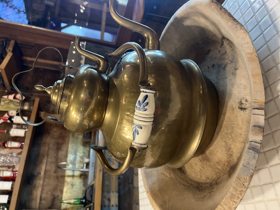 A vintage, ornate brass samovar sits inside a weathered, light-colored wooden bowl. The samovar features multiple spouts, a patterned white and blue handle, and a complex, tiered upper section. The background reveals a rustic interior with wooden beams, bottles on shelves, and white tiled walls.