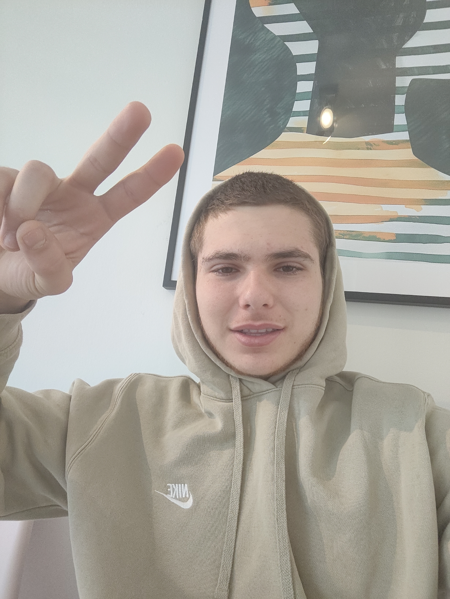 A young man wearing a tan hooded sweatshirt with the word "NIKE" stitched in white on the left breast is making a peace sign with his left hand. He appears to be indoors, with a white wall behind him and a framed piece of artwork hanging to his right. The artwork features a pattern of horizontal stripes, with some dark green and black shapes overlaid. The location in the city of Waregem, Belgium, is not evident from the image.