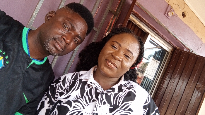 Two individuals, one male and one female, are depicted in a close-up, slightly upward-angled image. The male, positioned on the left, has dark skin, short dark hair, and light facial stubble; he is wearing a black collared short-sleeved shirt with blue-green trim and a yellow and green emblem on the left chest. The female, positioned to his right and slightly behind, has dark skin, dark curly hair, and is wearing a white collared long-sleeved shirt with a black abstract pattern; she has a prominent diastema (gap) between her upper front teeth. Both individuals are looking directly at the camera with smiles. The background consists of a wall painted in horizontal stripes of purple/lilac and a lighter beige/off-white. To the right of the female, a brown-framed window or doorway is visible, on which a white paper document with black text is affixed. Further to the right, a brown vertically-slatted metal shutter or door is partially visible. Exposed electrical wiring, including a small white junction box or fixture, is mounted on the upper wall. A dark mark or hole is also present on the wall. The scene is located in the city of Unknown, Unknown, likely depicting a building's exterior or entrance area.